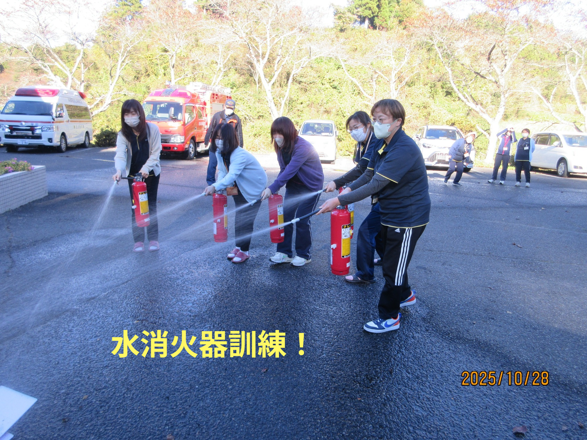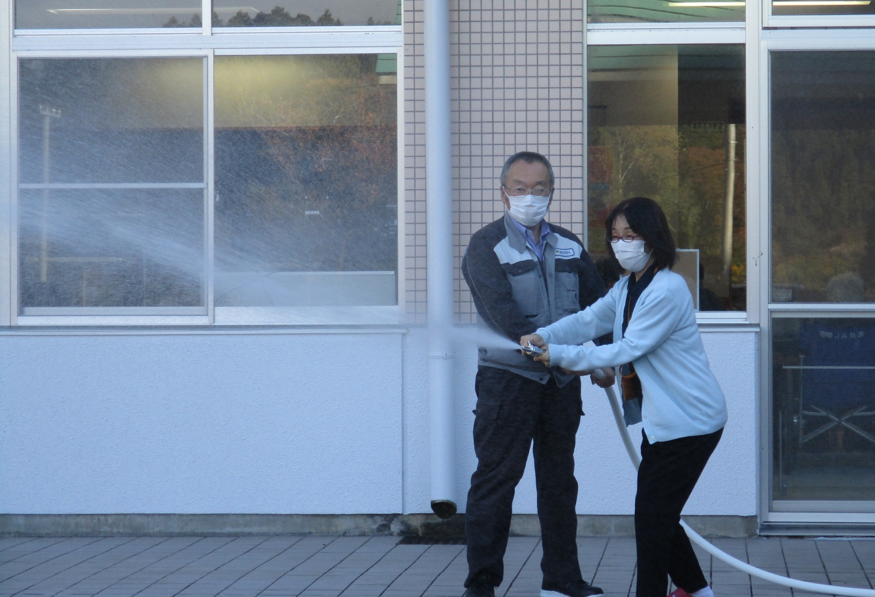 水消火器と屋内消火栓の取り扱い訓練も実施。