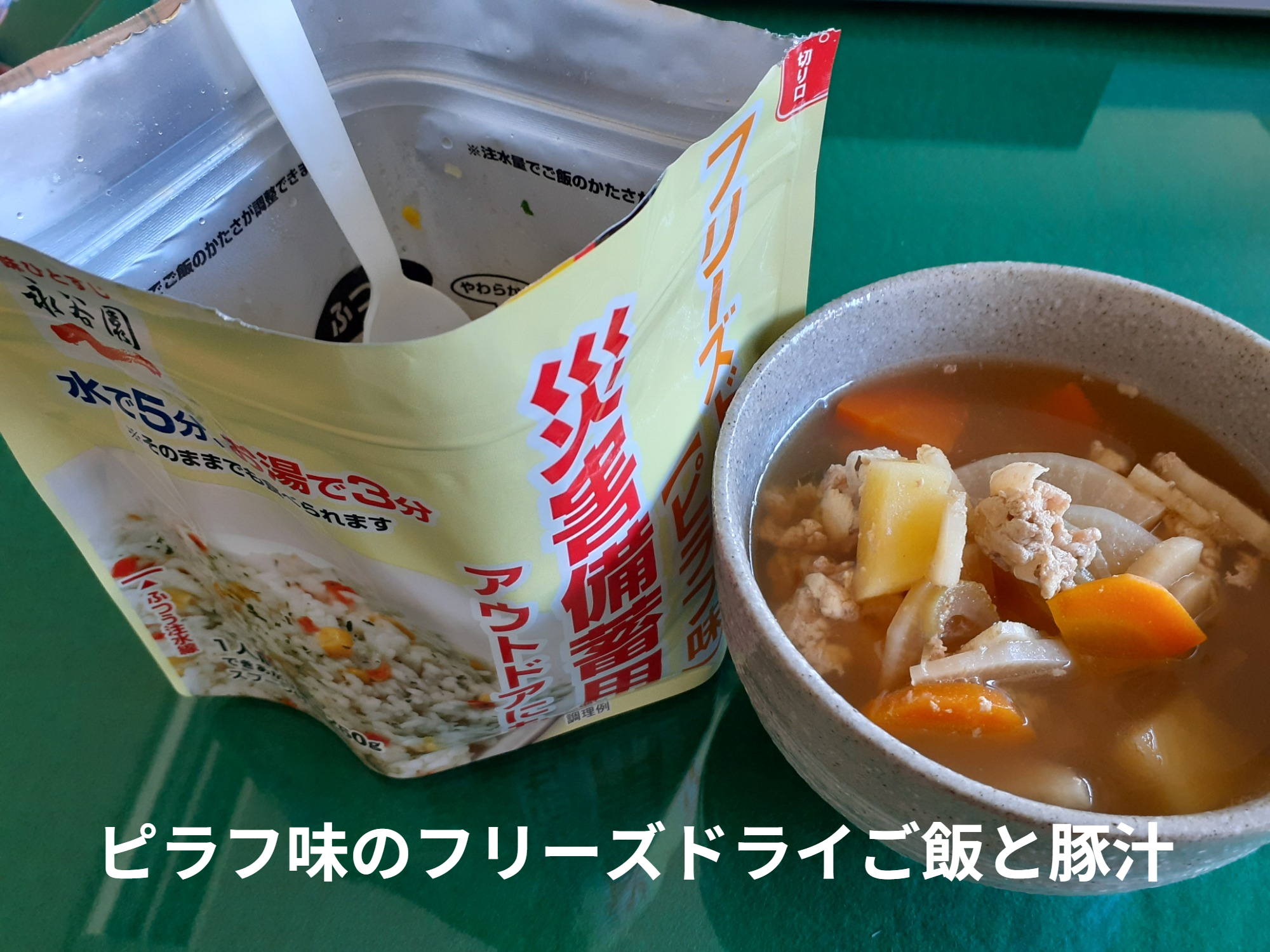 「非常食を食べてみよう」と題しまして、本日のお昼ご飯に職員みんなで災害備蓄用ご飯と、湯せんもできるポリ袋で作った豚汁を試食しました。🥢ポリ袋で豚汁ができることがおどろいた、フリーズご飯が思っていた以上においしかった、このようにして災害時に温かい食事が摂れたらとても嬉しいだろうなどの感想が聞かれました。 ごちそうさまでした!(^^)!