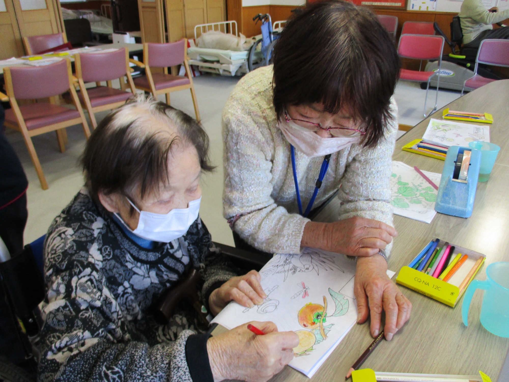 生徒さんと利用者さんで「何色が好きですか~?」などと会話を楽しみながら完成させました✨